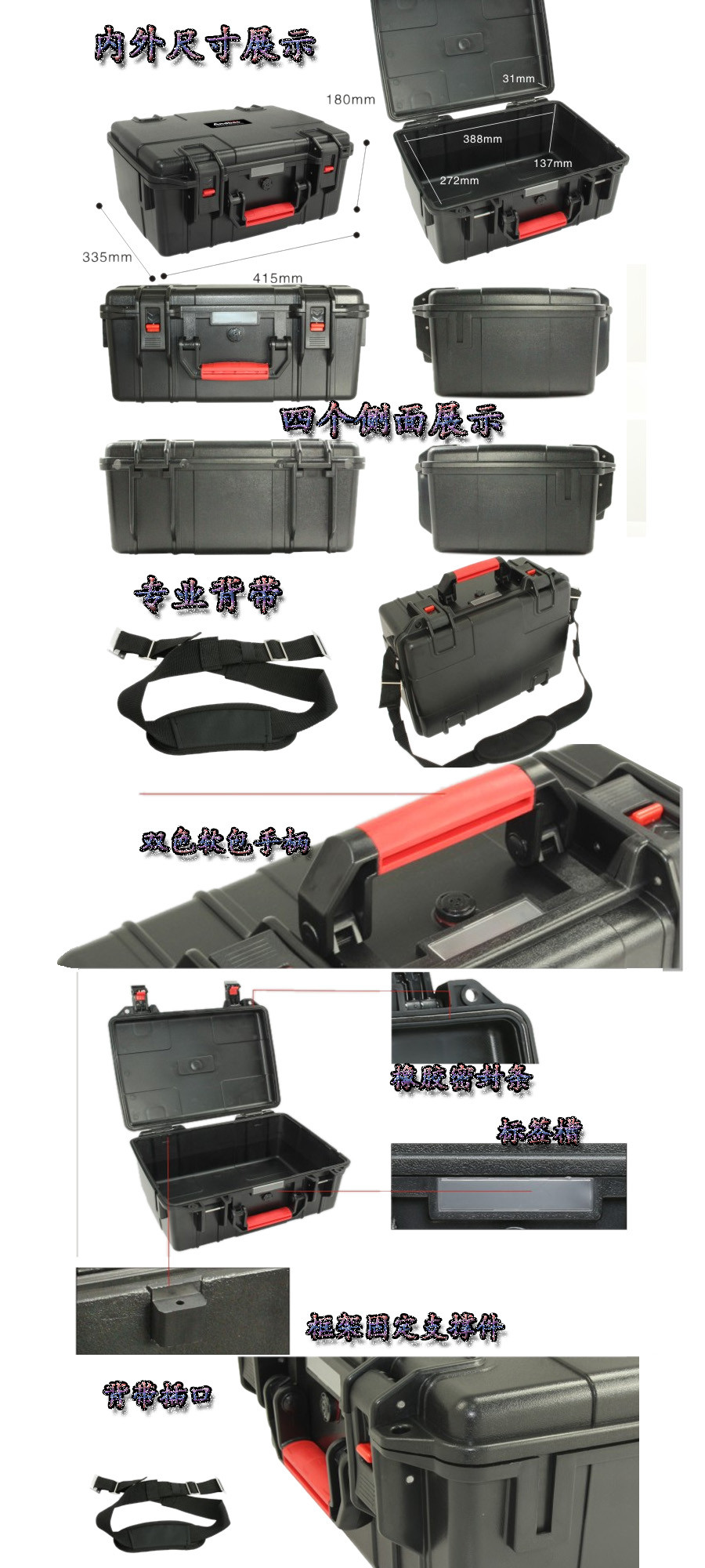 簡要說明:廣泛用于傳媒、公安、消防、軍隊、航空、戶外攝影、野外考察、科學(xué)探測等眾多領(lǐng)域的高端儀器、儀表。具有高強(qiáng)度、高抗壓沖擊、防潮、絕對密封、防塵、防水等特點。產(chǎn)品材質(zhì):ABS原料,箱體采用高抗沖擊的高分子聚合材料一體注塑成型,密封采用扁型彈性發(fā)泡密封橡膠條,確保防水氣密,所有較軸均采用不銹鋼材質(zhì)。